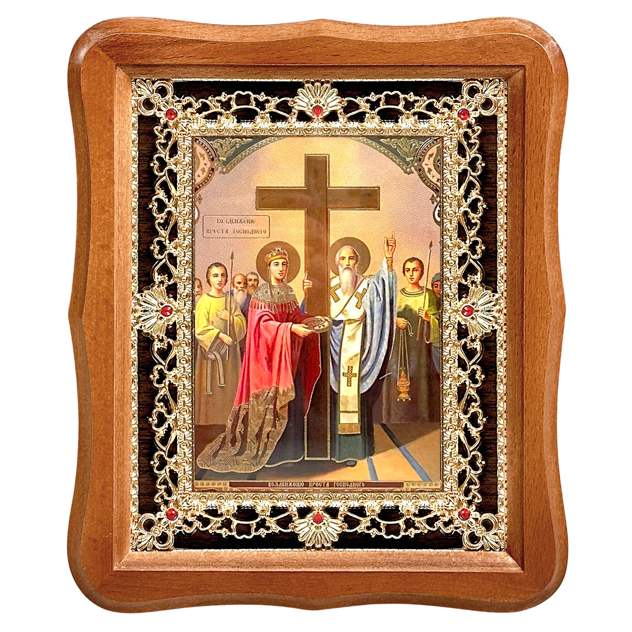 Ікона Воздвиження хреста Господнього, лик 15х18 см, у світлому дерев'яному кіоті з камінням