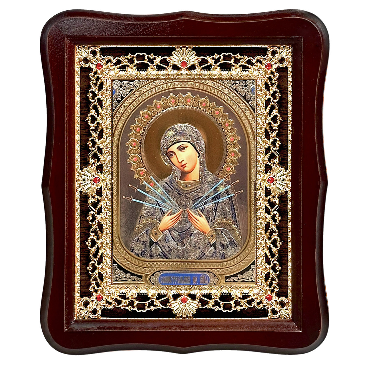 Ікона Семистрільна Пресвята Богородиця, лик 15х18 см, у темному дерев'яному кіоті з камінням
